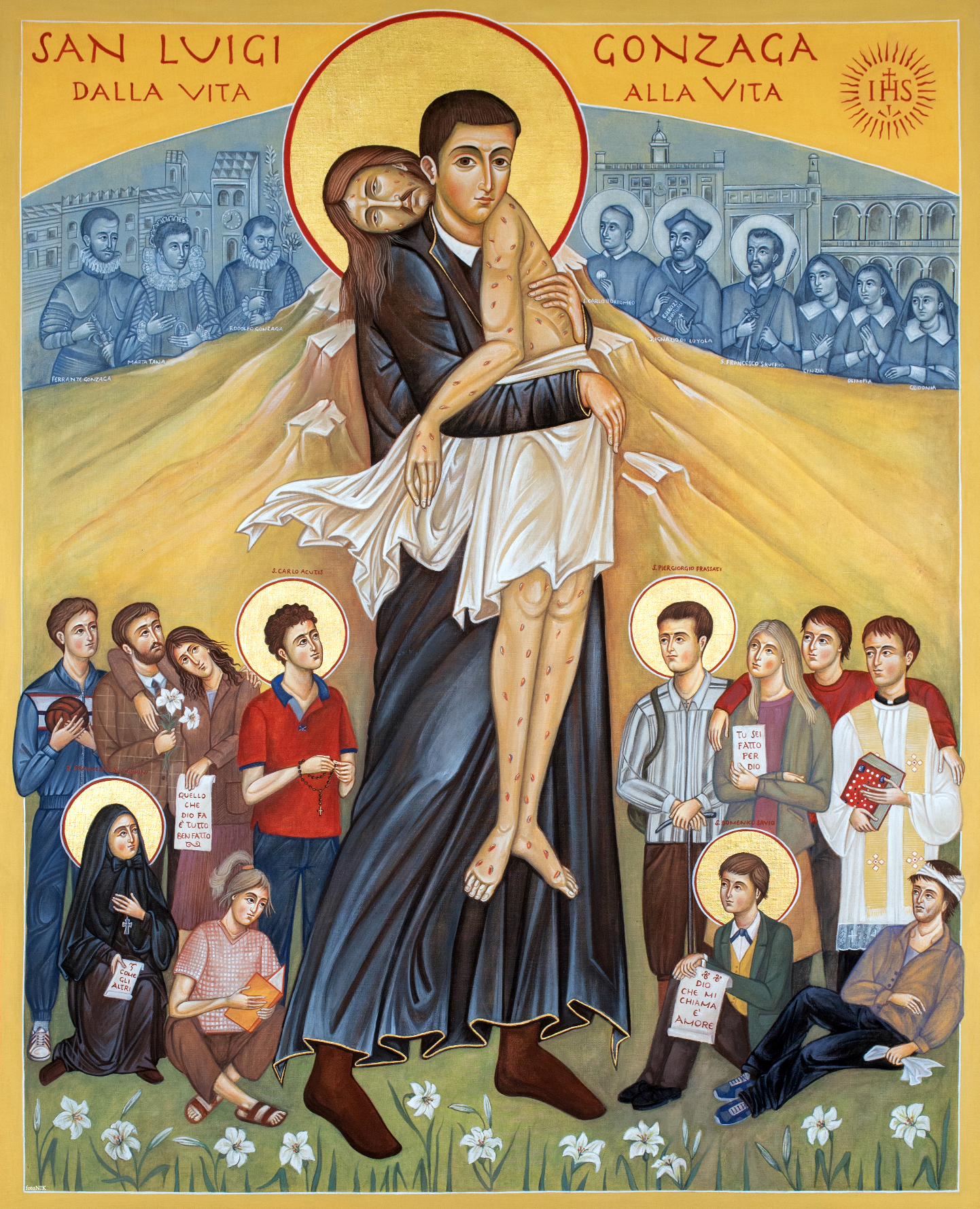 Al centro dell’icona c’è il frutto maturo della sua santità personale: Luigi è raffigurato nell’atto di abbracciare un uomo appestato che assume le sembianze di Gesù e la postura del suo corpo crocifisso. Cristo è il samaritano dell’umanità ferita; dalla sua parola sappiamo che ogni gesto di bene fatto al fratello è fatto a Lui che si identifica con i bisognosi. L’aureola, infatti, unifica entrambe le figure di Luigi e dell’appestato: come Cristo ha donato sé stesso, così il giovane Luigi ha offerto il proprio corpo in un martirio d’amore. È proprio questo amore donato ad impreziosire il suo corpo e a trasfigurare la sofferenza dell’altro. Le due figure sono sostenute da un’imponente montagna, allusione alla salita al cielo e alla stabilità della casa costruita sulla roccia.