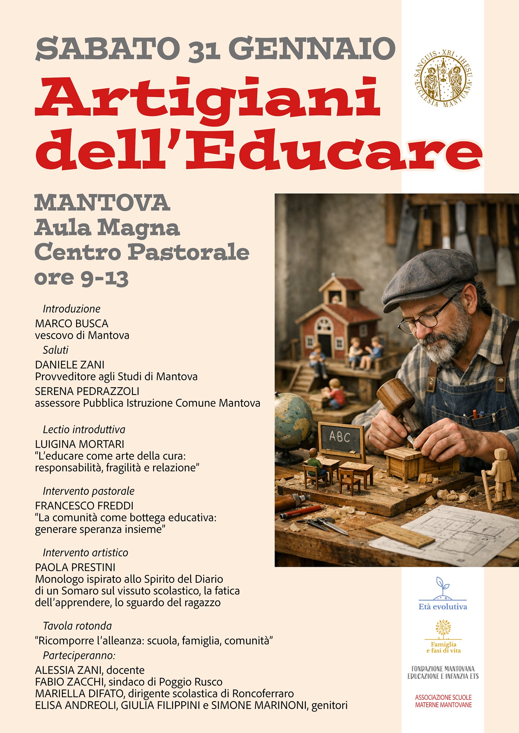Sabato 31 gennaio 2026 dalle 9.00 alle 13.00 nell'Aula Magna del Centro pastorale diocesano si terrà il convegno Artigiani dell’educare, promosso da Associazione Scuole Materne Mantovane e FISM in collaborazione con il Tavolo per l'Età evolutiva e il Tavolo per la Famiglia.