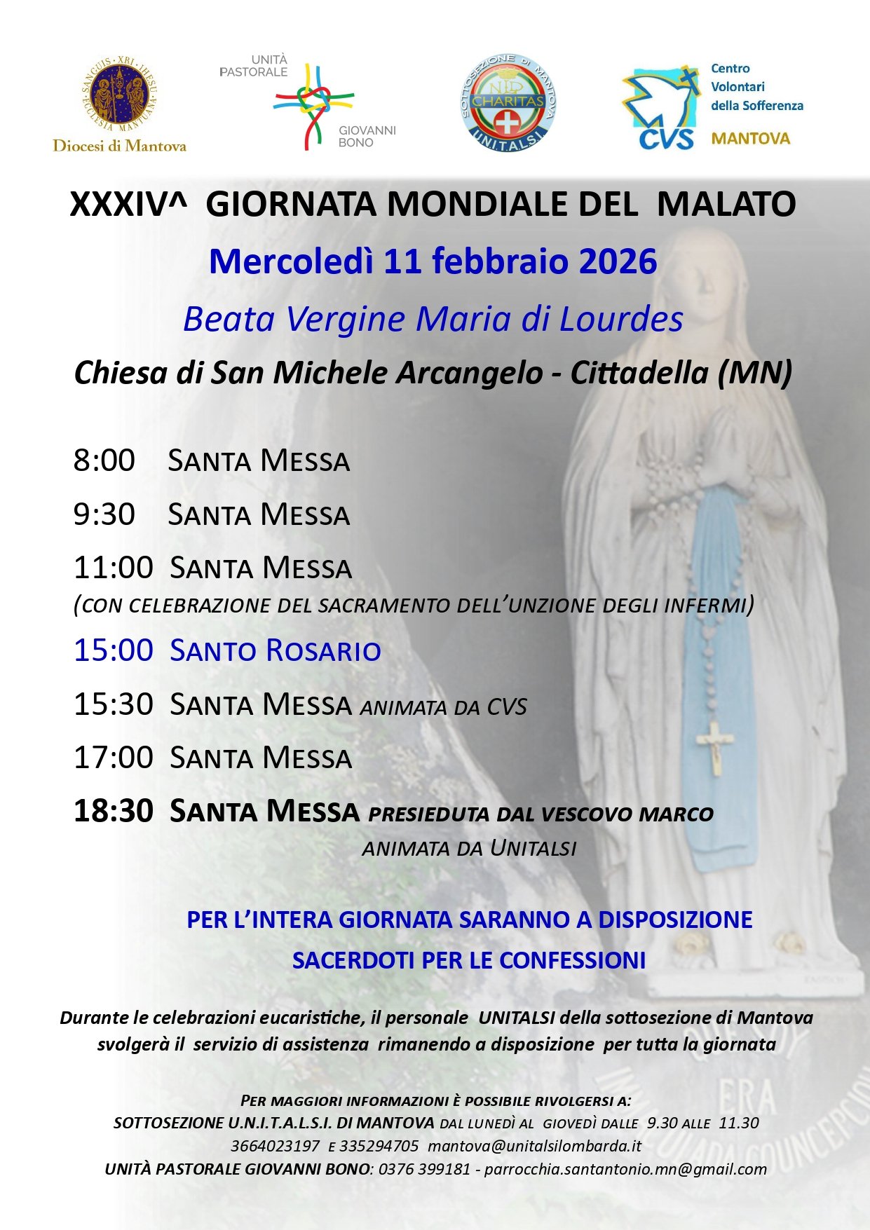 Durante le celebrazioni eucaristiche, il personale UNITALSI della sottosezione di Mantova svolgerà il servizio di assistenza, rimanendo a disposizione per tutta la giornata.
