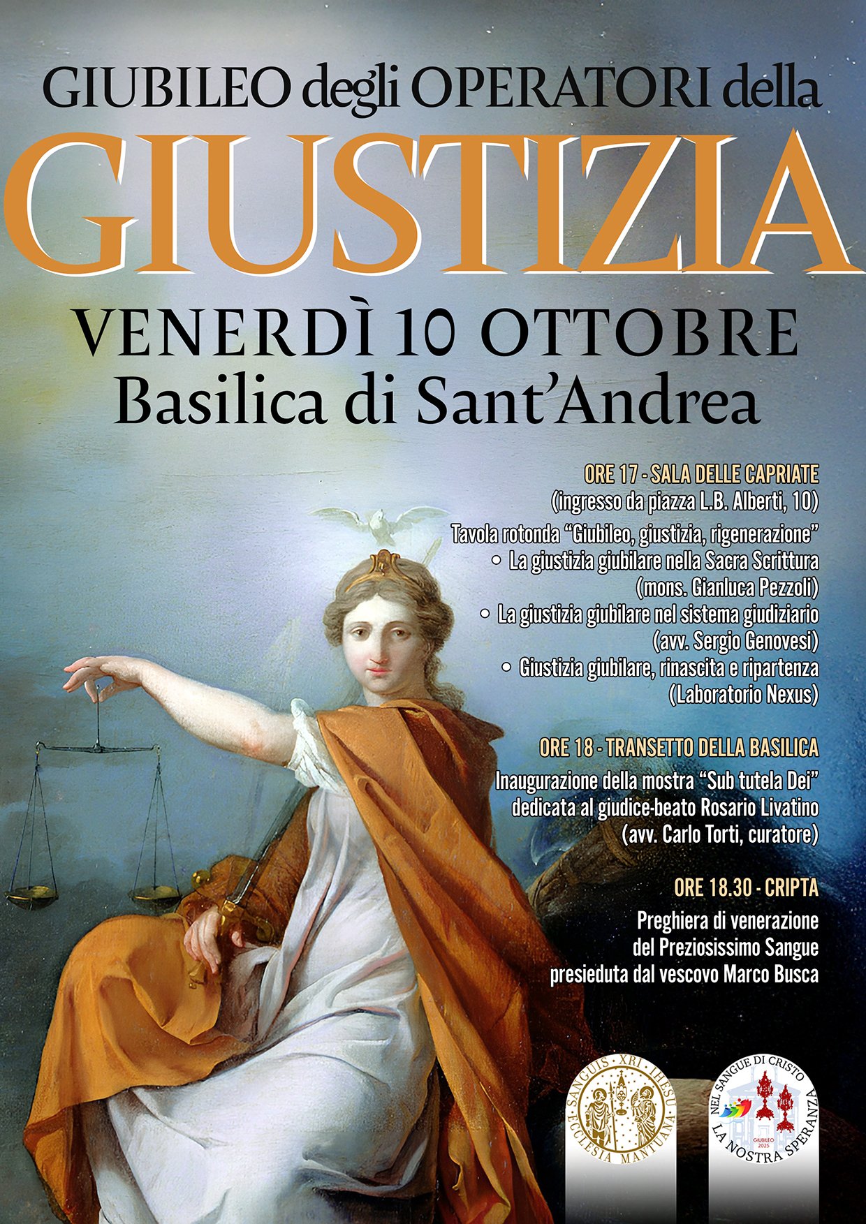 Concluderà il pomeriggio un momento di preghiera davanti alla reliquia del Preziosissimo Sangue, presieduto dal vescovo, preparato dall'Unione Locale Giuristi Cattolici Italiani di Mantova, con letture dal libro del profeta Amos e con riferimenti alla figura di un professionista del diritto dei nostri tempi, Giorgio Ambrosoli, uomo dalla solida formazione cristiana, che ha saputo coniugare i valori della fede con il rigore della professione forense e delle virtù civili e, in ragione di questo, è stato ucciso.