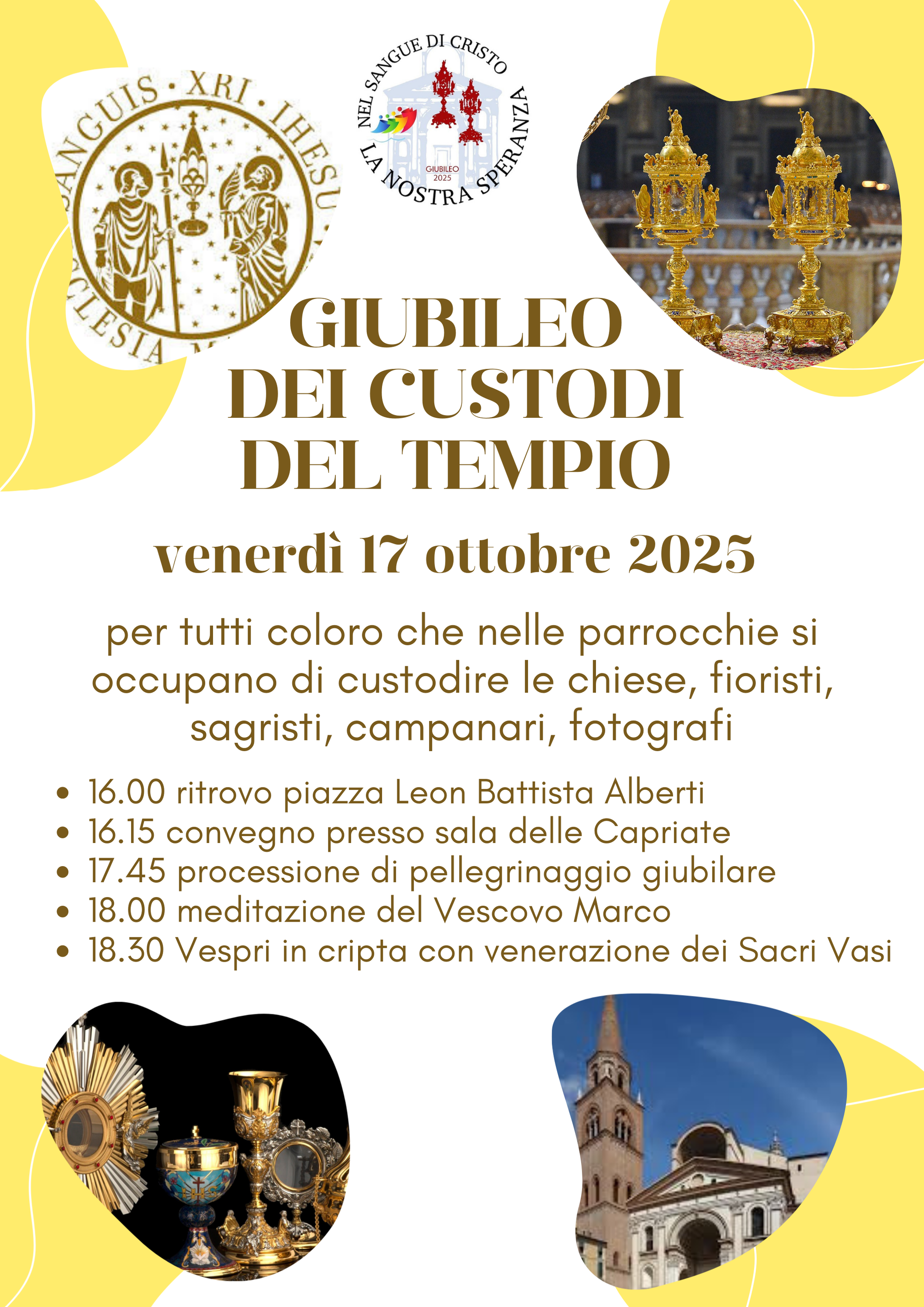 Venerdì 17 ottobre la diocesi di Mantova celebrerà il Giubileo dei Custodi del Tempio, a cui sono invitati sacristi, fioristi, campanari, fotografi, e tutti coloro che, con dedizione e discrezione, si prendono cura delle nostre chiese perché siano pulite, ordinate e accoglienti.
