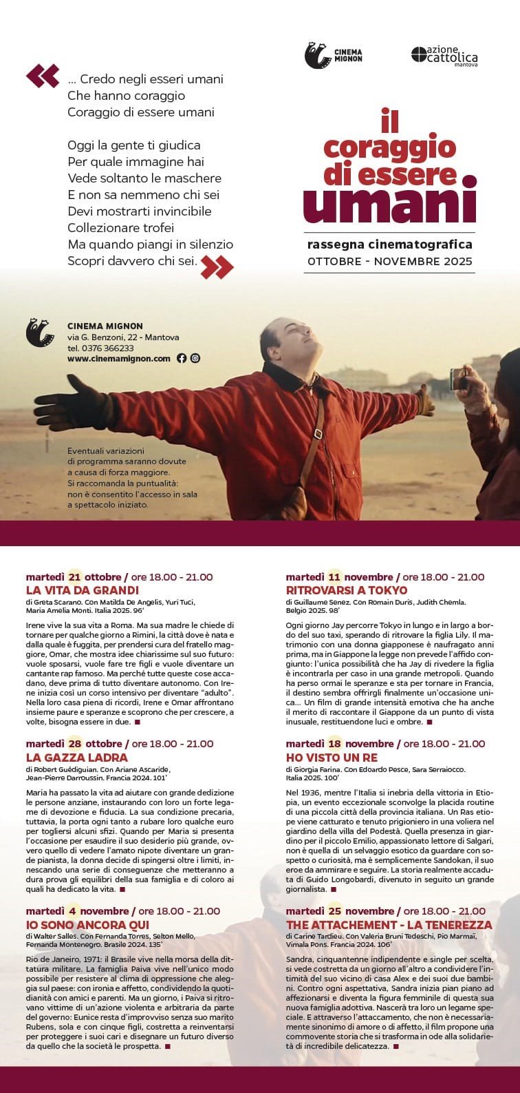 Ritorna la rassegna cinematografica organizzata dall’Azione Cattolica diocesana in collaborazione con il cinema Mignon, un’esperienza pluridecennale che ha avuto la sua origine alla fine degli anni Ottanta: una proposta di film legati ad un nucleo tematico comune, con l’obiettivo di fare cultura e creare dibattito nella comunità mantovana. Non, dunque, una rincorsa a proiezioni legate al successo di pubblico o di critica, ma il tentativo di offrire pellicole di qualità artistica che possano condurre alla riflessione comune e al confronto aperto su un argomento che interessa il vissuto umano fatto di ricchezze e limiti.