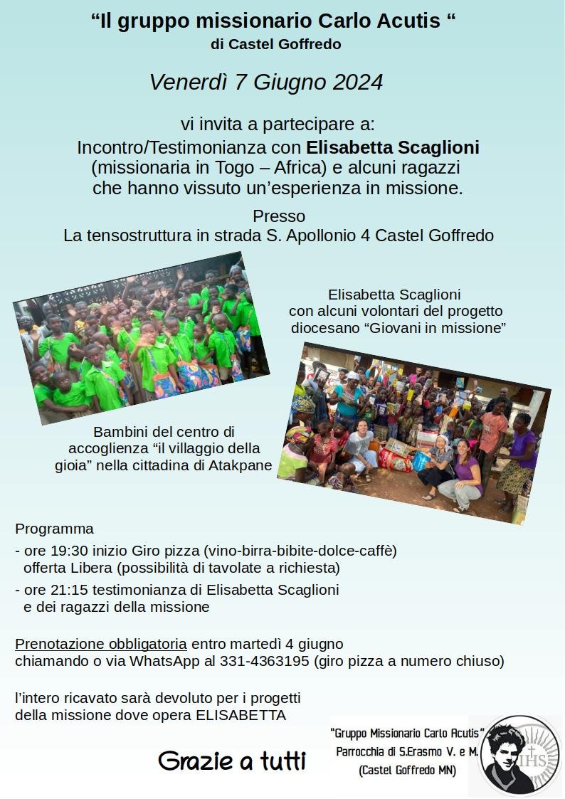 La serata, a cura del Gruppo missionario "Carlo Acutis" si terrà presso la tensostruttura di strada S. Apollonio 4 e prevede un giropizza a offerta libera (su prenotazione), e a seguire la testimonianza di Elisabetta e di alcune ragazze che hanno vissuto un'esperienza nella sua missione in Togo.