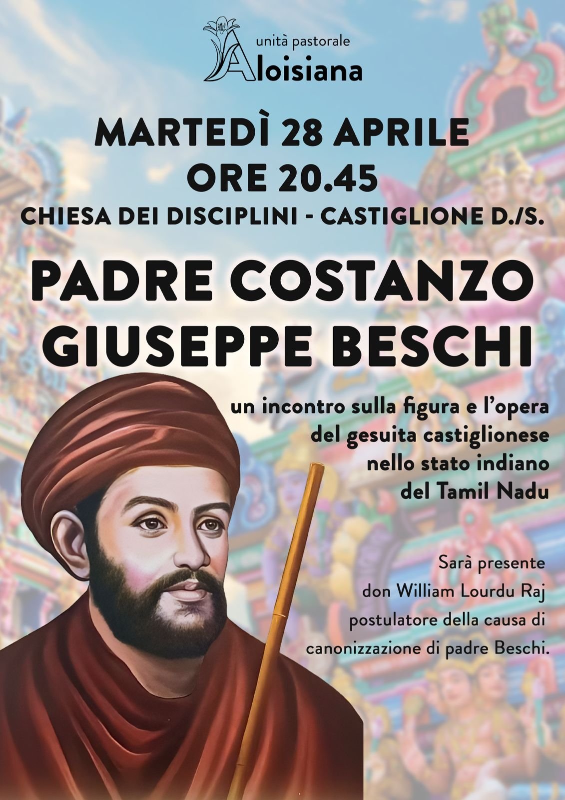Martedì 28 aprile a Castiglione si terrà un incontro sulla figura e l'opera di padre Costanzo Giuseppe Beschi, gesuita castiglionese del Settecento che fu missionario nello stato indiano del Tamil Nadu; si inculturò totalmente negli usi e costumi locali come i grandi missionari gesuiti (es. Matteo Ricci) diventando il maggior letterato della lingua tamil, al punto da pubblicare il primo dizionario in quella lingua e comporre poemi che gli hanno fatto meritare la denominazione di "Dante della letteratura tamil". In India è conosciutissimo e venerato come un santo.