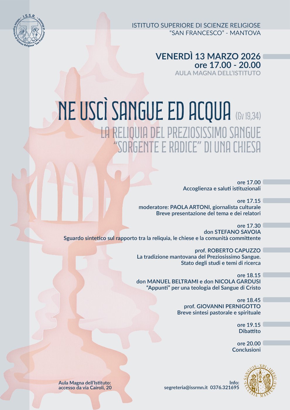 La reliquia del Preziosissimo Sangue “sorgente e radice” di una Chiesa, precisa il sottotitolo. I contributi infatti non vorrebbero solo mettere in evidenza l’impatto storico-culturale e artistico che l’inventio della reliquia ha innegabilmente e palesemente provocato sulla nostra realtà mantovana, ma anche il valore teologico, il riflesso spirituale e le conseguenze ecclesiali e pastorali che comporta la presenza di un tale segno. Esso infatti ci è dato come origine e fondamento di una Chiesa con il suo forte rimando all’Incarnazione, alla Passione-Morte e Resurrezione di Gesù di Nazareth. Inoltre la presenza di questa “terra intrisa di sangue” può ricordare l’agire e il permanere del Risorto Crocifisso nella storia attraverso l’annuncio dei Vangeli, la forza simbolica dei sacramenti e la vita della comunità cristiana.