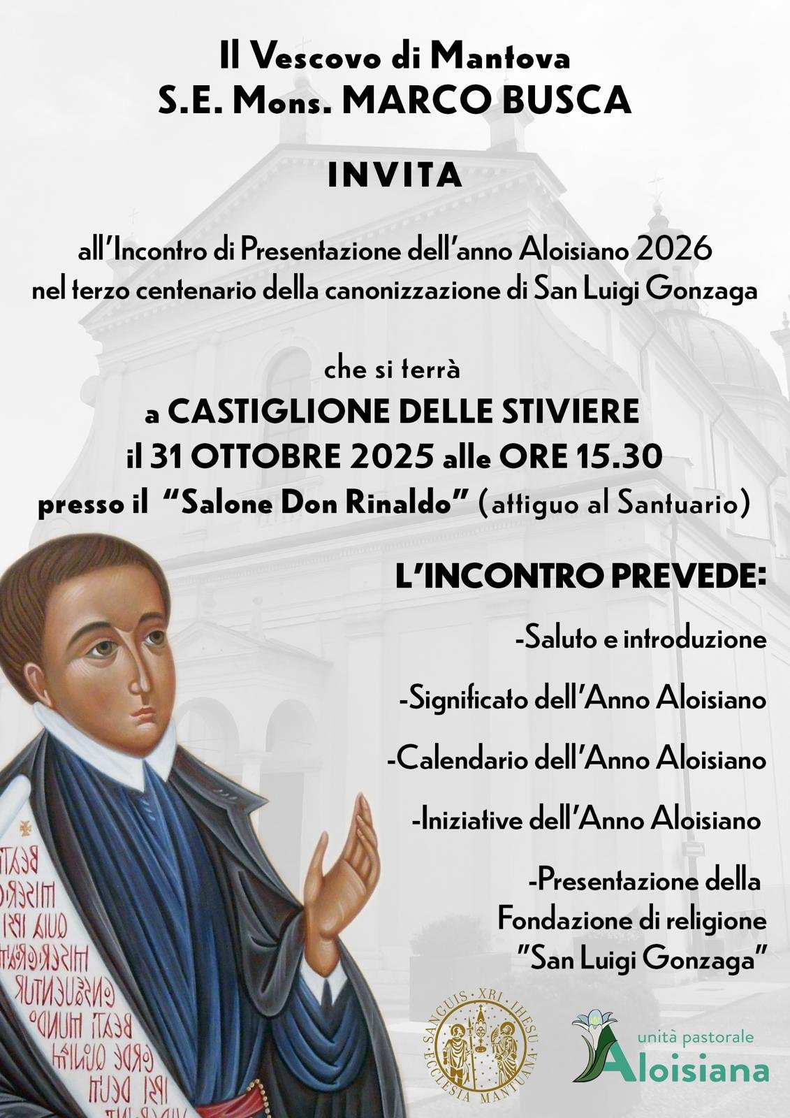 Il vescovo di Mantova S.E. mons. Marco Busca è lieto di invitare all’incontro di presentazione dell’Anno Aloisiano 2026, nel terzo centenario della canonizzazione di San Luigi Gonzaga, che si terrà