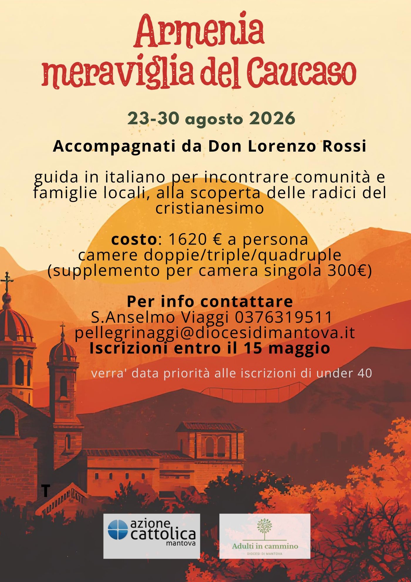 Il Tavolo per gli Adulti in cammino e l’Azione cattolica diocesana, in collaborazione con l’agenzia Sant’Anselmo Viaggi, propongono dal 23 al 30 agosto 2026 un viaggio in Armenia, che avrà uno spirito incentrato sulla condivisione del tempo e degli spazi, senza rinunciare ai comfort necessari per vivere un'esperienza piacevole, ma con scelte volte a rendere il viaggio accessibile a più persone (es. pernottamento preferenziale in camere doppie, triple o quadruple). All’atto dell'iscrizione verrà data priorità alle persone under 40, a cui la proposta è principalmente rivolta.