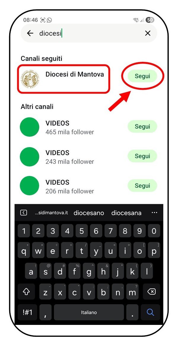Nella barra di ricerca digitare poi “Diocesi di Mantova” e il canale comparirà sotto.