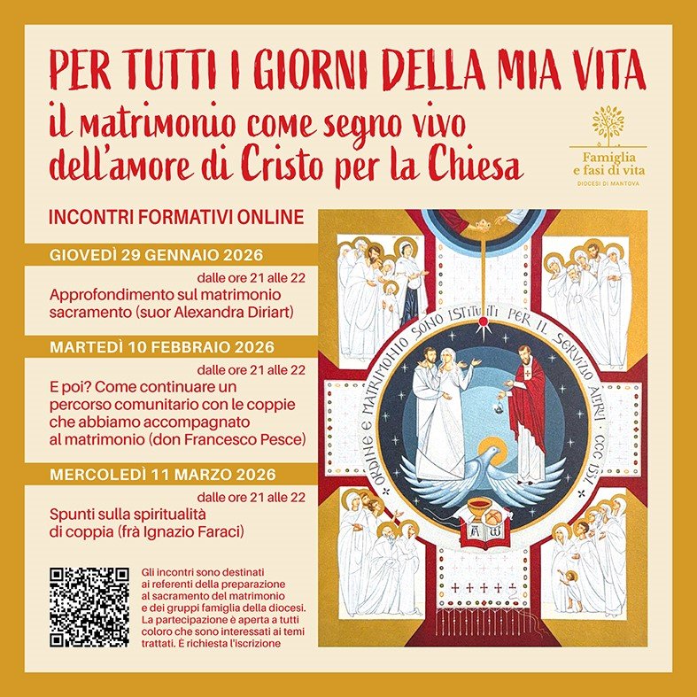 Il Tavolo per la Famiglia e le fasi di vita propone il percorso formativo Per tutti i giorni della mia vita: il matrimonio come segno vivo dell’amore di Cristo per la Chiesa. Si tratta di tre incontri online, che hanno come primi destinatari i referenti della preparazione al sacramento del matrimonio e dei gruppi famiglia della nostra diocesi, ma sono comunque aperti a tutti coloro che sono interessati ai temi trattati.