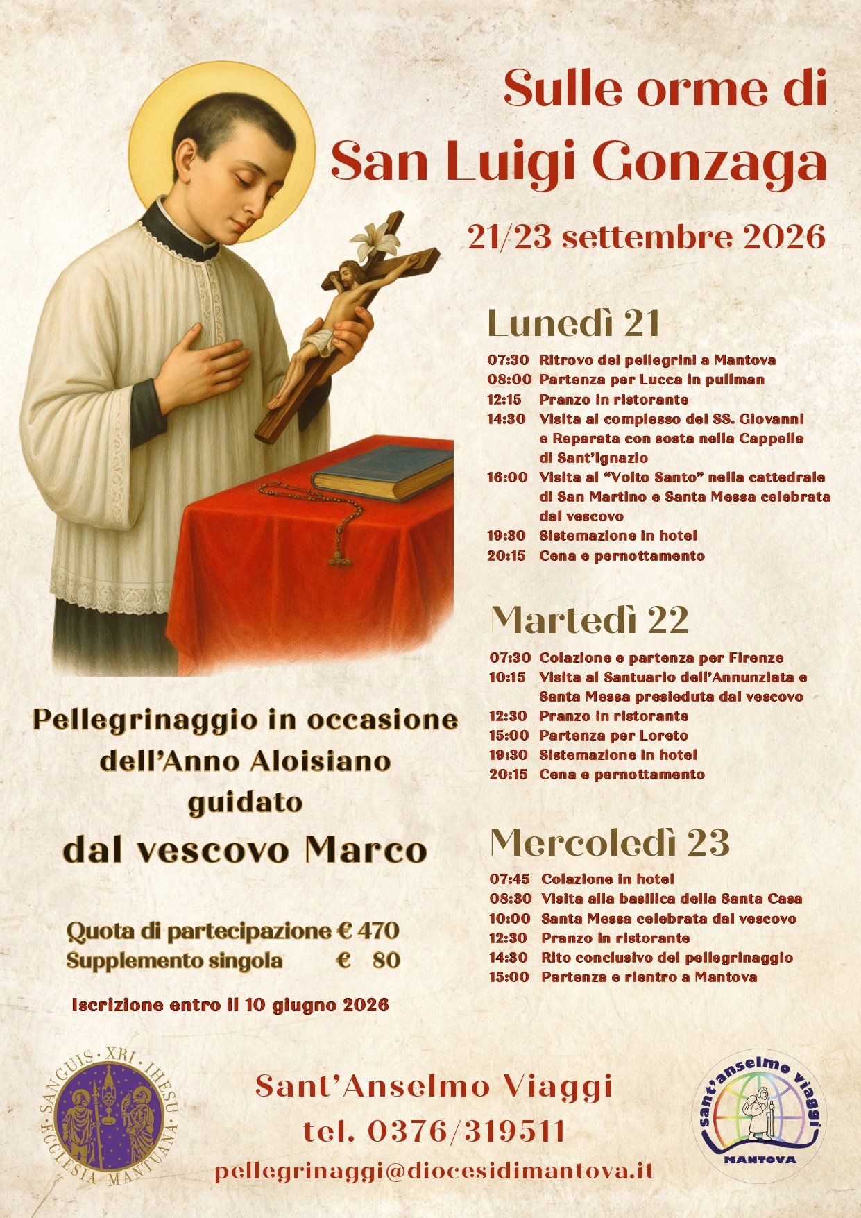 Infine la tappa a Loreto, alla basilica della Santa Casa. Sappiamo infatti che il celebre santuario mariano fu meta di pellegrinaggio anche del santo mantovano, a conferma della forte spiritualità mariana che coltivava sin dalla giovinezza.